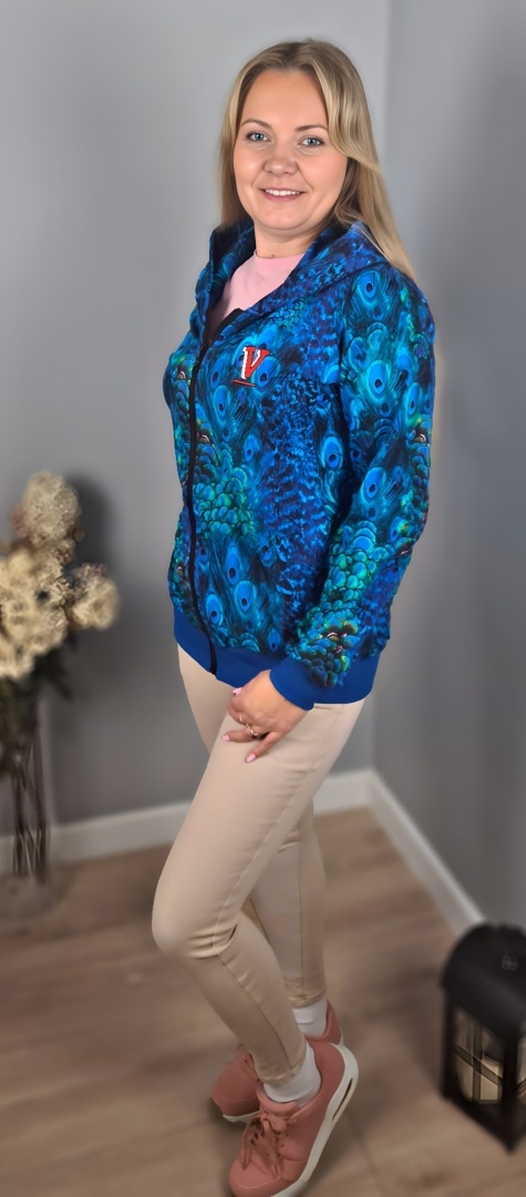 Bluza z autorskim wzorem inspirowanym pawimi piórami w intensywnych, nasyconych odcieniach niebieskiego i zieleni.
